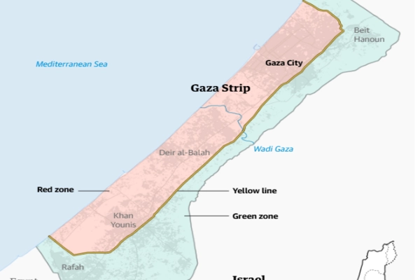 The Guardian'ın incelediği ABD askeri planlama belgelerine ve Amerikan planları hakkında bilgi sahibi kaynaklara göre, yabancı güçler başlangıçta İsrail askerleriyle birlikte Gazze'nin doğusuna konuşlanacak ve harap olmuş şerit, mevcut İsrail kontrolündeki "sarı hat" ile bölünecek.