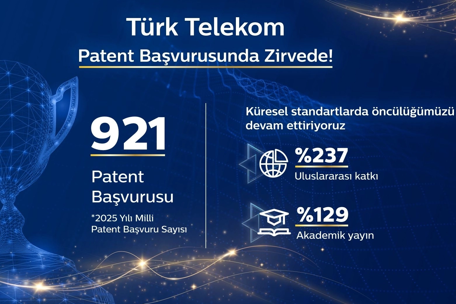 Türkiye’nin “Milli Teknoloji Hamlesi” yolculuğunda önemli bir rol üstlenen Türk Telekom, T.C. Sanayi ve Teknoloji Bakanlığı tarafından açıklanan 2025 verilerine göre milli patent başvurularında 921’e ulaşarak bu alandaki liderliğini korudu. Türk Telekom, 2024’te kazandığı Fikri Mülkiyet Liderliği’ni 2025 yılında da sürdürürken uluslararası standartlara katkı ve akademik yayın gibi Ar-Ge çıktılarında da önemli bir ivme yakaladı. Türk Telekom’un uluslararası standartlara katkısı yüzde 237 artarken, akademik yayın sayısı yüzde 129 yükseldi. Küresel standartlarda öncülüğünü devam ettiren Türk Telekom, Uluslararası Telekomünikasyon Birliği-Telekomünikasyon Standartlaştırma Birimi’ne (ITU-T) en fazla katkı sağlayan Türk firması olmasının yanı sıra, Üçüncü Nesil Mobil İletişim Ortaklık Projesi (3GPP) ve Avrupa Telekomünikasyon Standartlar Komitesi (ETSI) bünyesinde yürütülen 6G çalışmalarıyla da sektördeki lider konumunu güçlendirdi.