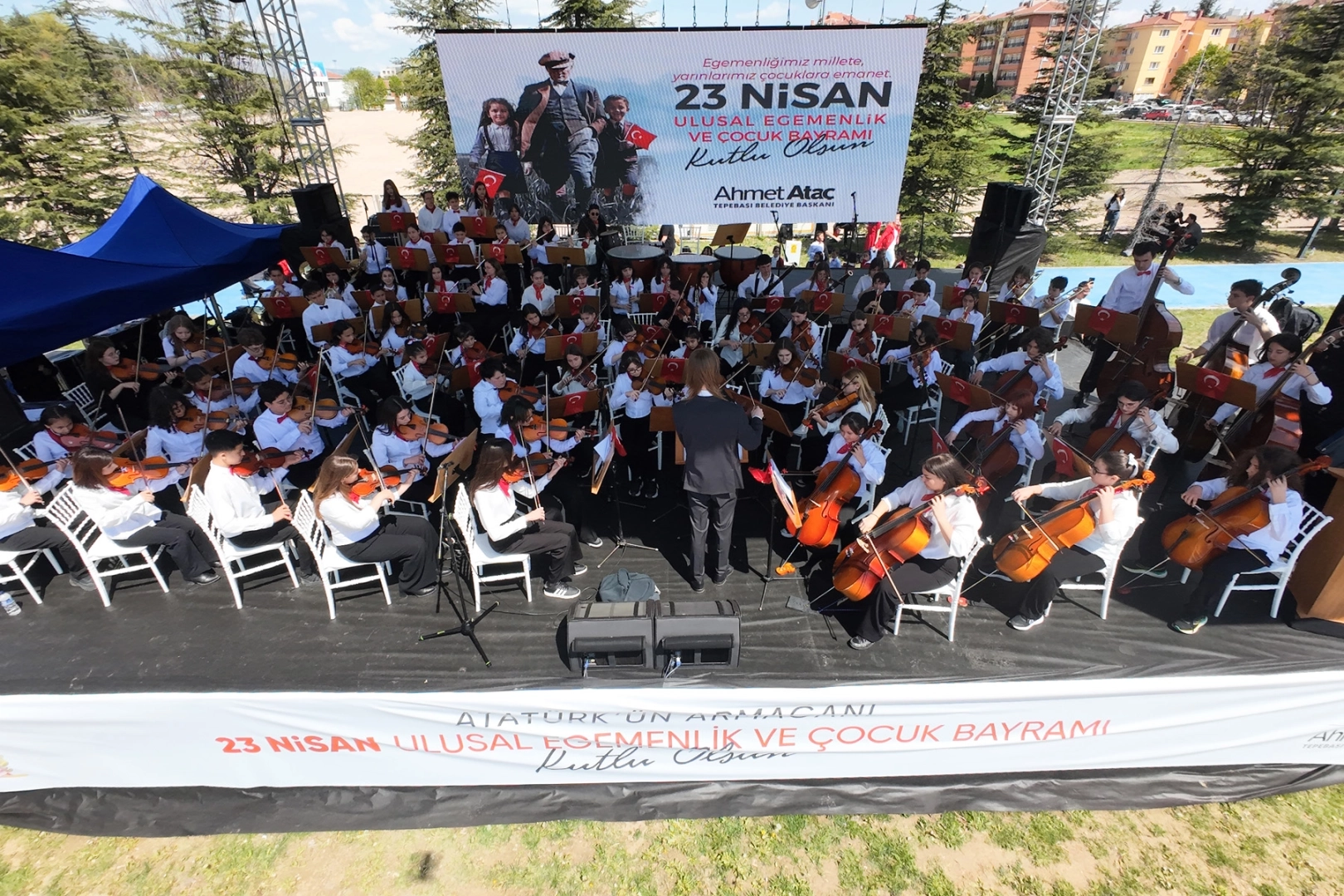 Vecihi Hürkuş Havacılık ve Teknoloji Parkı’nda gerçekleşen 23 Nisan Ulusal Egemenlik ve Çocuk Bayramı kutlamalarına binlerce kişi katıldı. Tepebaşı Belediye Başkanı Dt. Ahmet Ataç’ın da yer aldığı kutlamalar, İki Elin Sesi Var Çocuk ve Gençlik Senfoni Orkestrası’nın konseri ile başladı. Orkestra şefliğini Serhan Gencer’in üstlendiği konserde yer alan 61 çocuk, Türk Marşı, Çiçeklerin Valsi, Chamambo ve Caravan eserlerini icra etti. Ardından ise İki Elin Sesi Var Çocuk Korosu’ndan 45 çocuk sahneye çıkarak orkestra ile birlikte Atatürk Çocukları, Atam Sen Rahat Uyu, 23 Nisan Kutlu Olsun, Günaydın Çocuklar, Bugün Bayram, Hayat Bayram Olsa ve Ata’ya Mektup isimli eserlerini seslendirdi. Orkestra ve koro katılımcılardan tam not aldı.