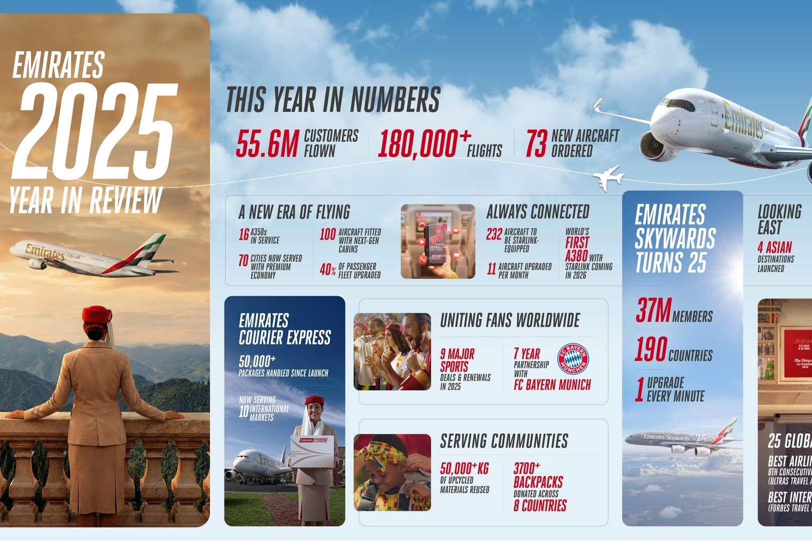 Emirates, son 12 ayda hem yerde hem de havada premium ve aile seyahati deneyimini geliştirdi. Temmuz ayında Dubai Uluslararası Havalimanı Terminal 3’te, First Class yolcuları ve Skywards Platinum üyeleri için özel Emirates First check-in alanı açıldı. Uçak içinde ise sınırsız havyar servisi için yeni sunumlar, özel tasarım menüler ve Michelin yıldızlı hizmet standartlarında eğitim veren Dubai’deki Hospitality Excellence Merkezi öne çıktı. 2025 yılı, Emirates’in dünya çapında kazandığı 25 ödülle taçlandı.