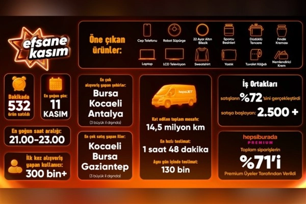 Hepsiburada’da Kasım ayında trafik rekoru kırıldı. Bu yıl Efsane Kasım’ın en yoğun günü 11 Kasım oldu. Kullanıcılar en çok 21.00–23.00 saatleri arasında alışveriş yaptı. Dönem boyunca 300 binden fazla kişi Hepsiburada’dan ilk kez alışveriş yaptı. Türkiye genelinde kampanya süresince dakikada 532 ürün satıldı. Hepsiburada platformunda bu sene Efsane Kasım kampanya döneminde verilen siparişlerin sayısı geçen seneye kıyasla yüzde 16 oranında arttı.