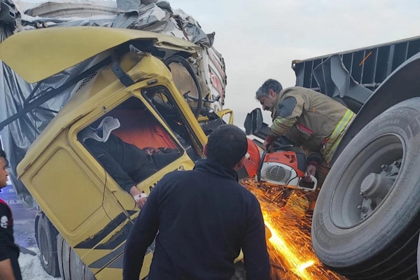 Edinilen bilgilere göre, seyir halindeki bir tırın, o sırada dönüş yapmakta olan başka bir tıra çarpmasıyla oluşan kazada 3 kişi yaralandı.
